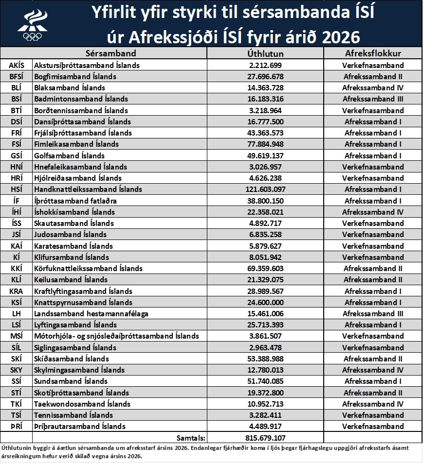 Framkvæmdastjórn Íþrótta- og Ólympíusambands Íslands hefur samþykkt tillögur stjórnar Afrekssjóðs ÍSÍ um flokkun sérsambanda ÍSÍ í afreksflokka og úthlutun úr sjóðnum fyrir árið 2026, en úthlutun nemur alls tæpum 815,7 m.kr. að þessu sinni.